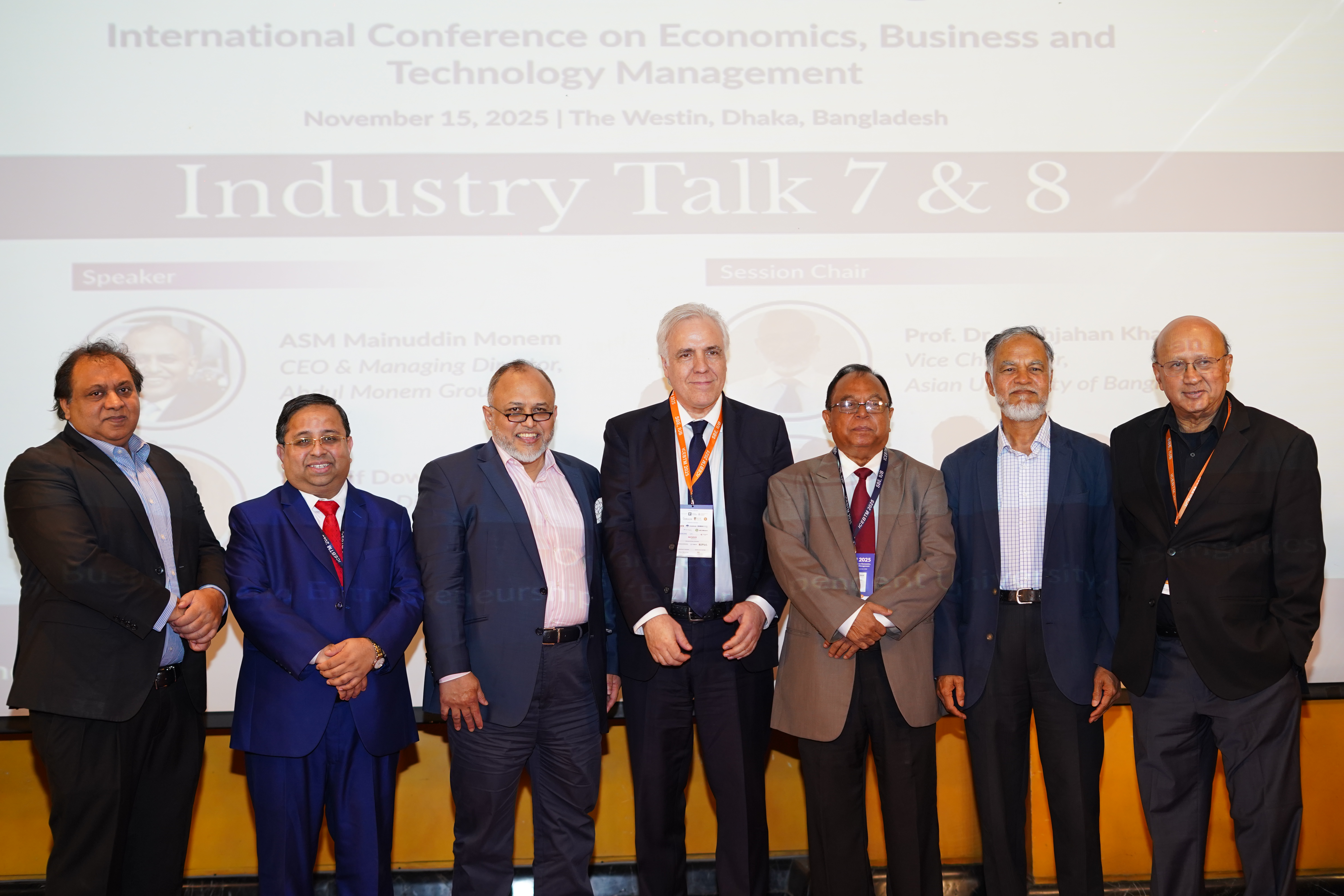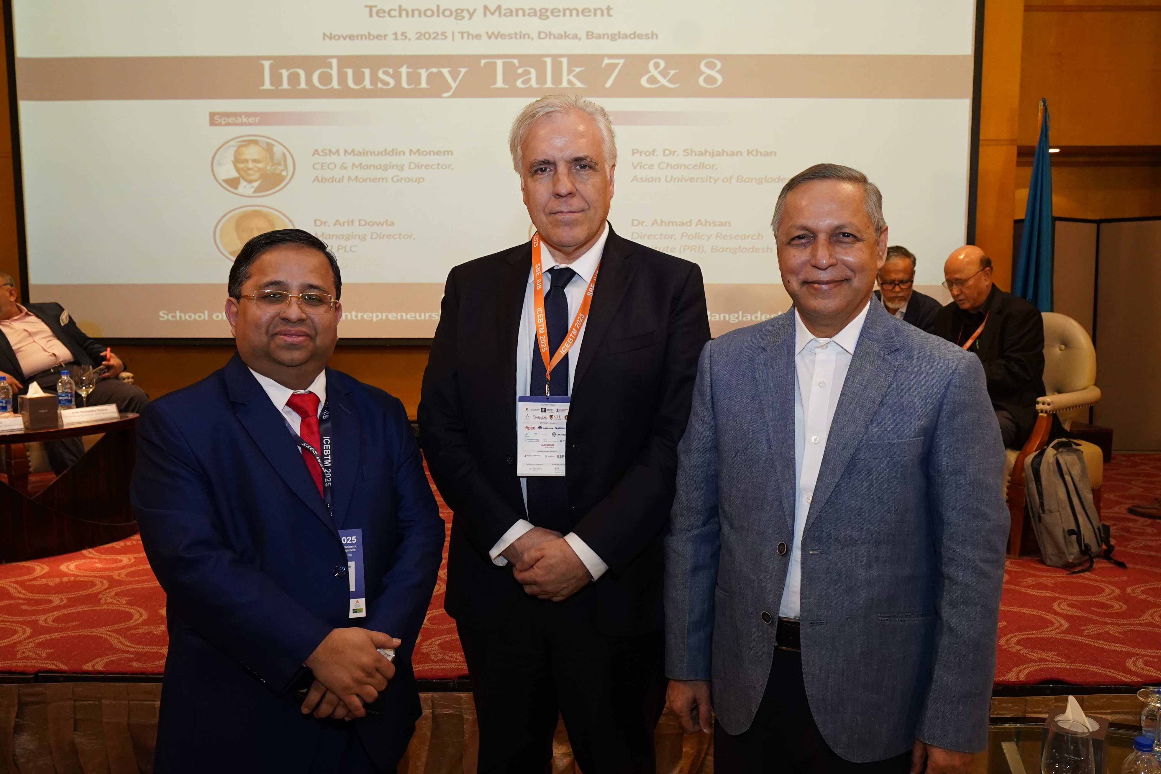 The afternoon session of ICEBTM 2025 showcased insightful Industry Talks by ASM Mainuddin Monem, CEO & MD of Abdul Monem Group, and Dr. Arif Dowla, Managing Director of ACI PLC. The session was chaired by Dr. Ahmad Ahsan, Director, Policy Research Institute (PRI), Bangladesh, and Prof. Ruhul A Salim, Curtin University, Australia. The session provided a platform for discussing the role of leadership, industrial growth, and technological innovation in shaping the nation’s future.